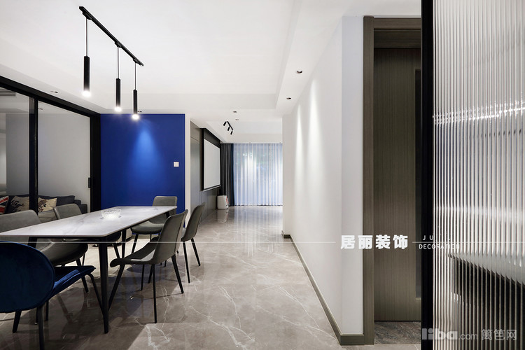 餐桌岩板台面加深色饰面,材质间的相互碰撞,相互平衡,让餐厅更具现代感的利落与精致之美。