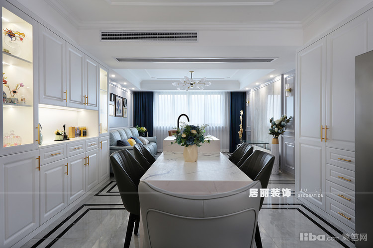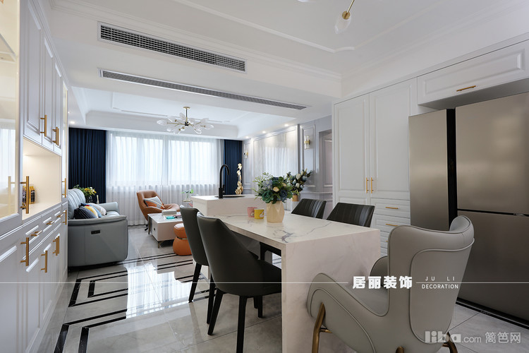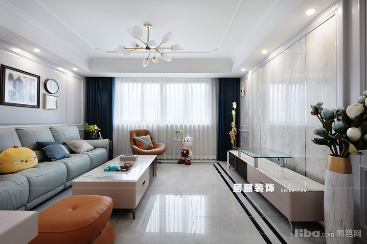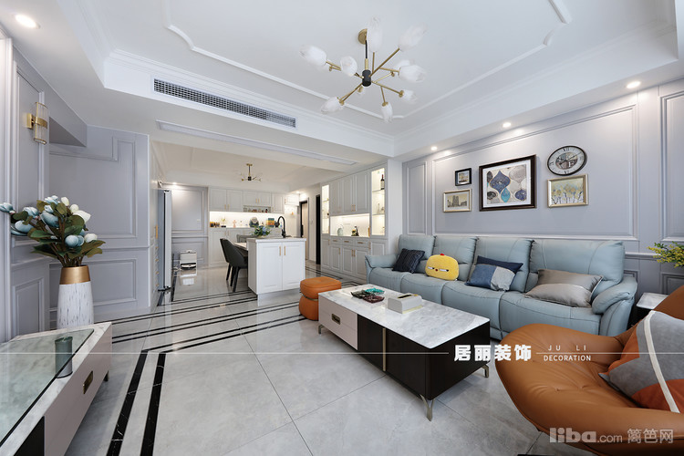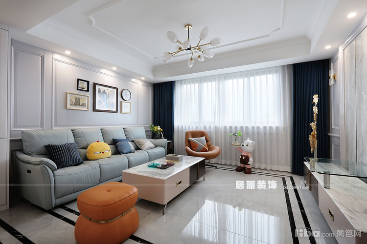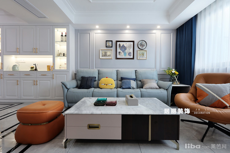 客厅,一家人每天都聚集于此。雾霾蓝、香槟金、爱马仕橙,大面积的墙面线条勾勒出美式的精致。