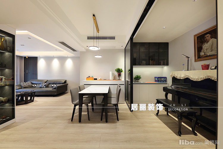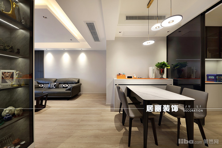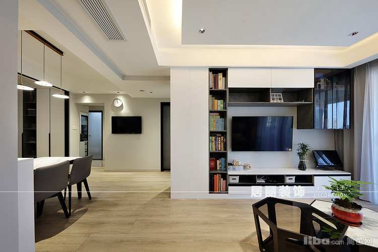 客厅采用整体通顶柜设计手法,满足展示功能的需求,增加空间延伸错落感