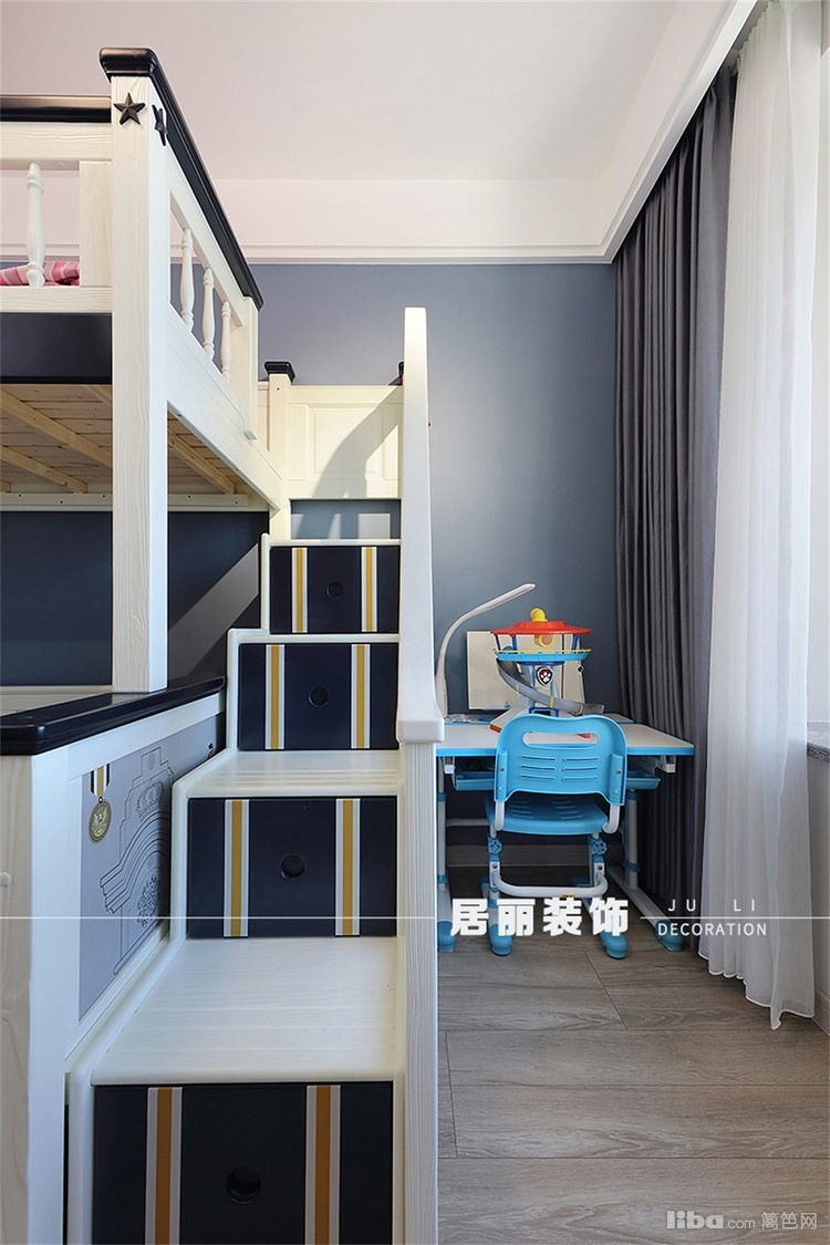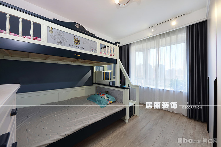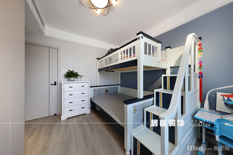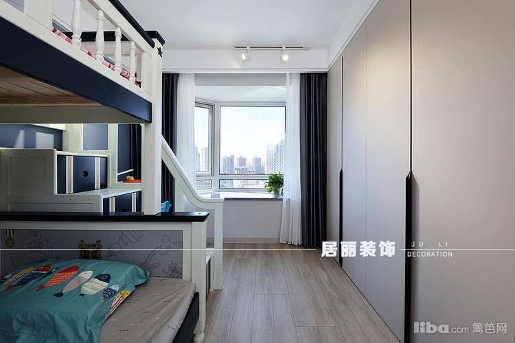 采用高低床靠墙方式,既可以让小朋友睡觉更具安全感,也可以释放西面的空间,做成通顶大衣柜,增加储物空间。