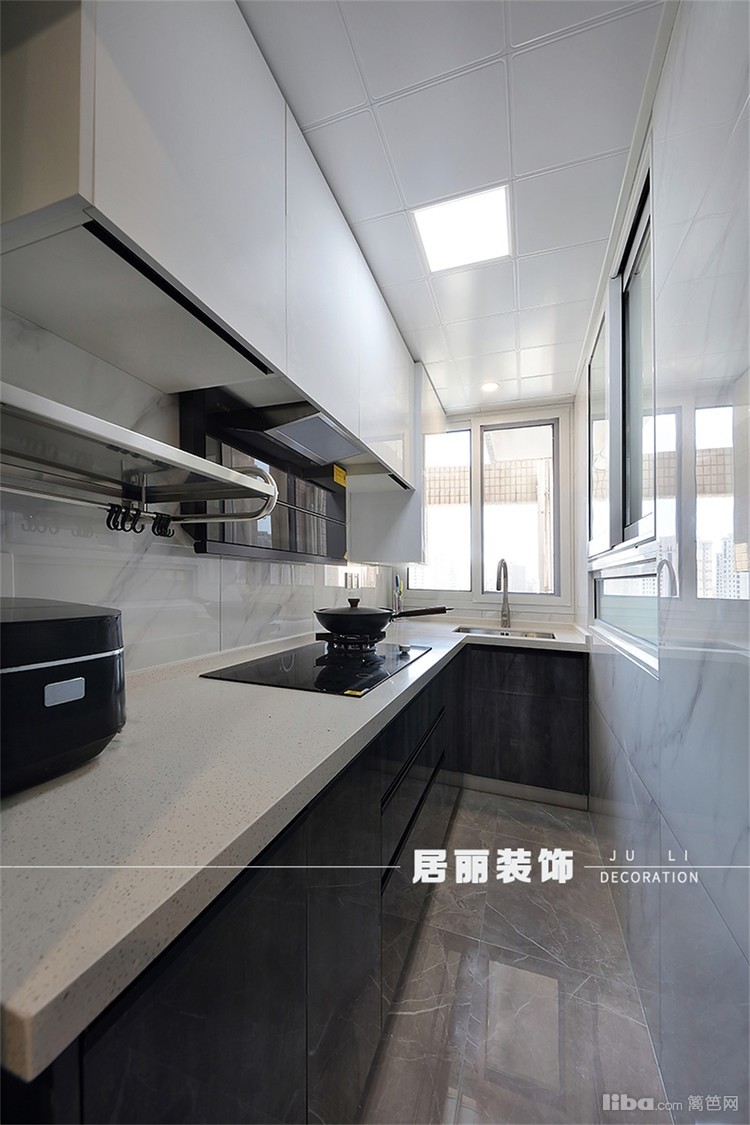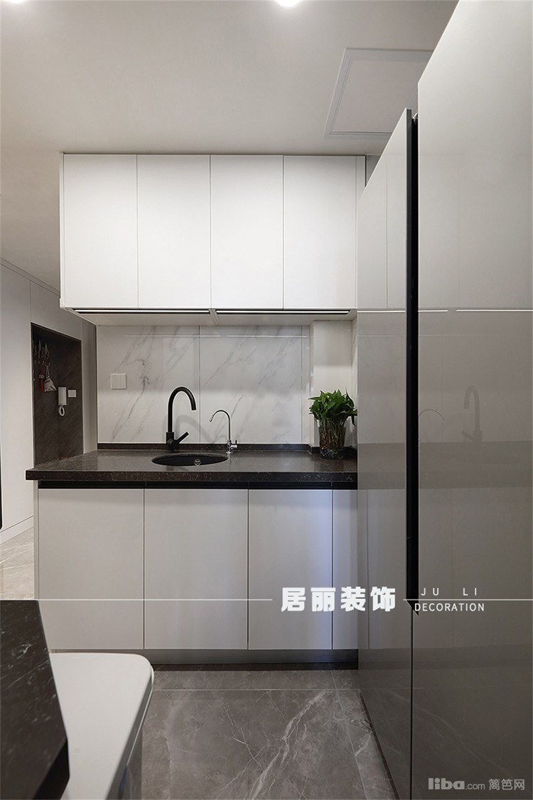 厨房采用了中西厨的方式, 把原有的生活阳台改成中厨,这样既提高空间利用率,也可以控制油烟。采用极窄边框玻璃门的方式来最大化引入光源。