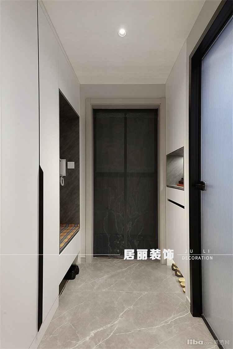 原户型视距进深过小,无法满足正常入户换鞋换衣功能,设计师向洗衣房借用空间,增加储物空间。