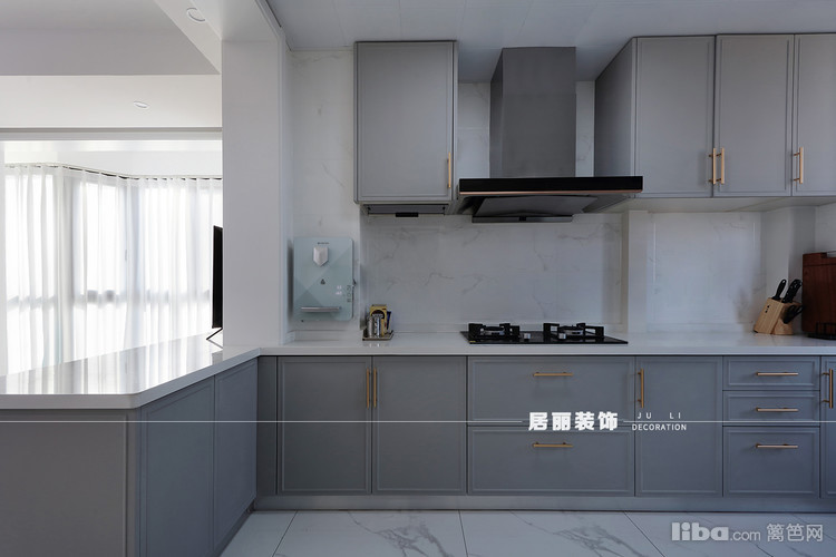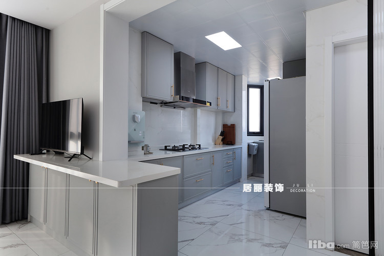 厨房采用开放式厨房,采用了U形柜连接吧台,操作台面相对宽敞。水槽台面高于烹饪区,更加符合人体工程学的要求。电器柜位于烹饪区对面,方便操作。