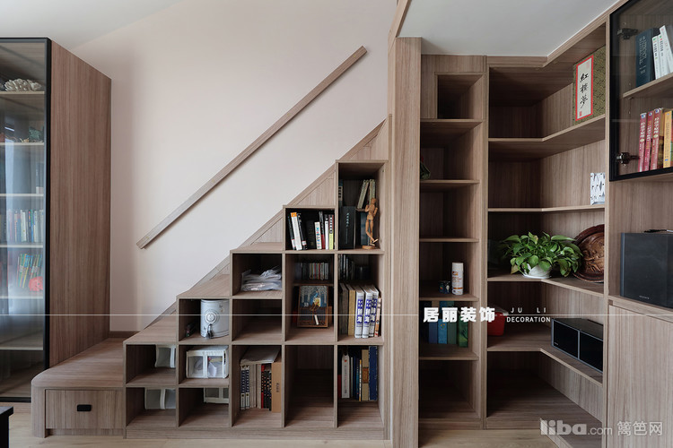 整个书房的亮点就在于二层到三层的楼梯。设计师没有用传统的钢木楼梯,而是采用了定制柜叠放的方式到三层,既充分利用空间,也满足业主藏书需求。