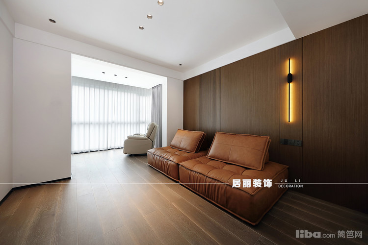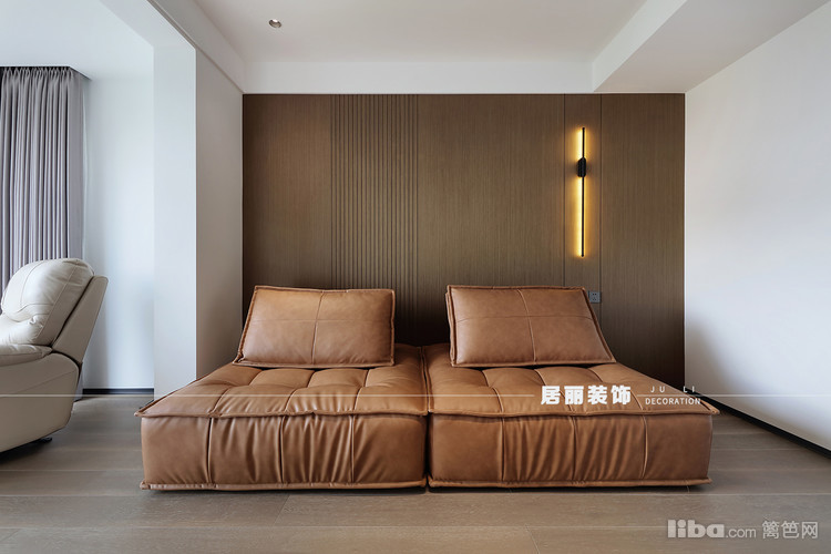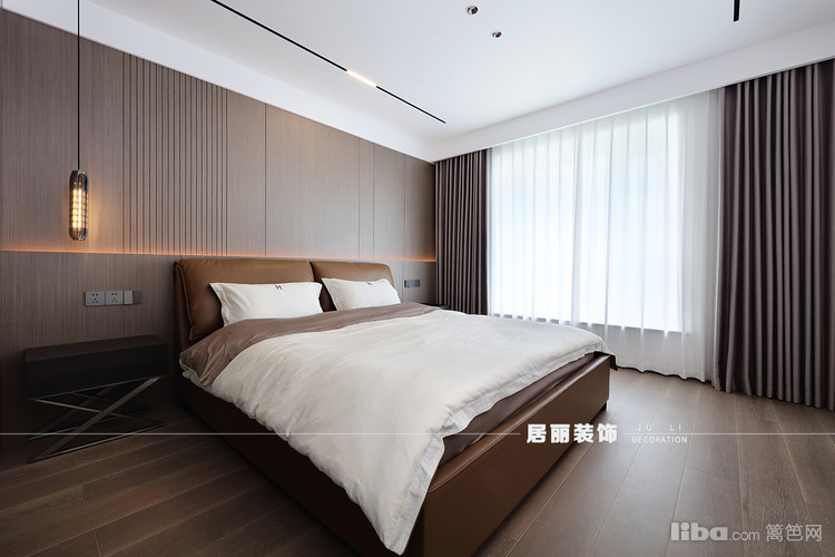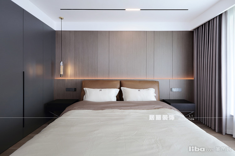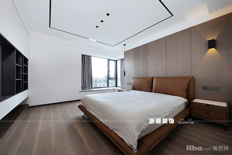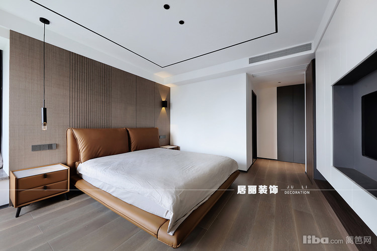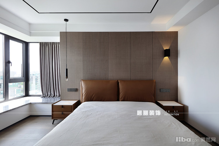 主卧没有繁复华丽的花样与纹饰,整体以温馨为出发点,选用现代简洁暖色的皮质床,通过材质变化,增加主卧整体质感,为卧室创造出一种自然简约的风范,充满静谧、安宁。