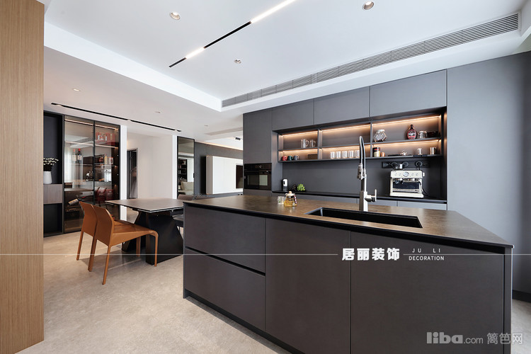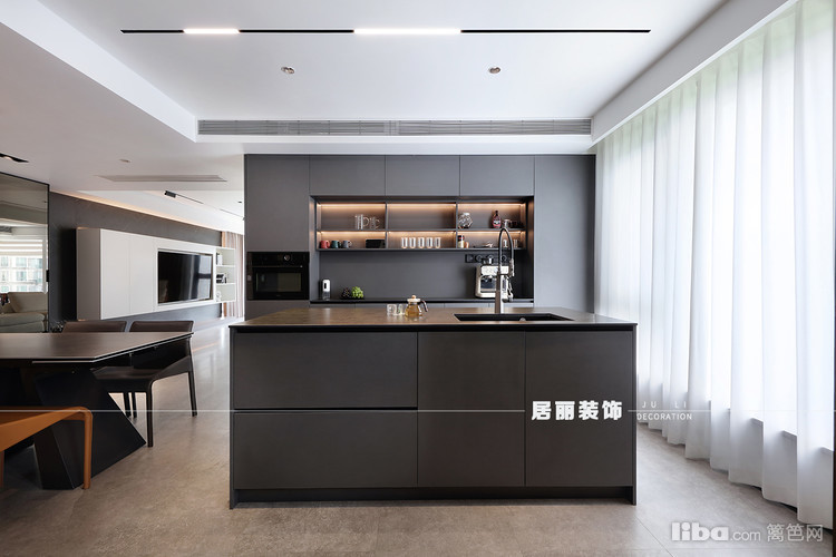 开放式厨房布局,增加家人间的互动性。整体色调以灰色为主,因西厨增加了储物空间,所以中厨没有做满墙的储物柜,而是进行了设计留白。