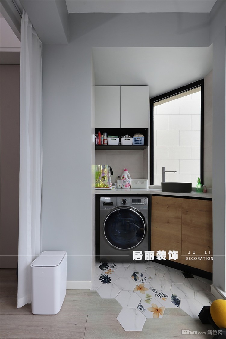 阳台纳入主卧,洗衣机地面六边形地砖和地板衔接,保证防水的同时,让空间新增一点俏皮