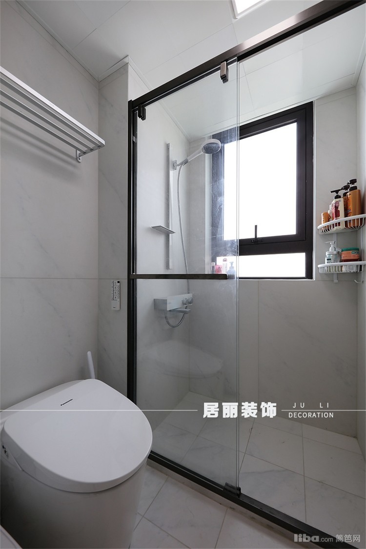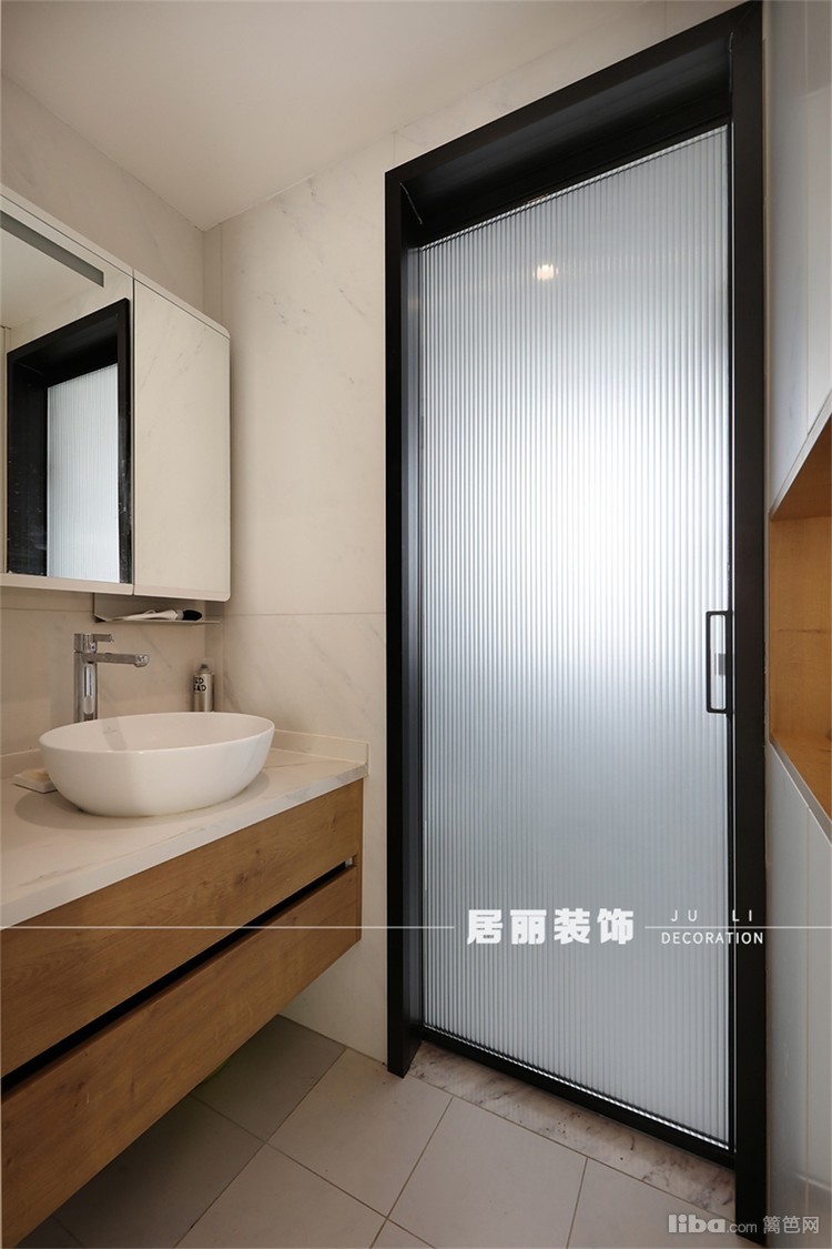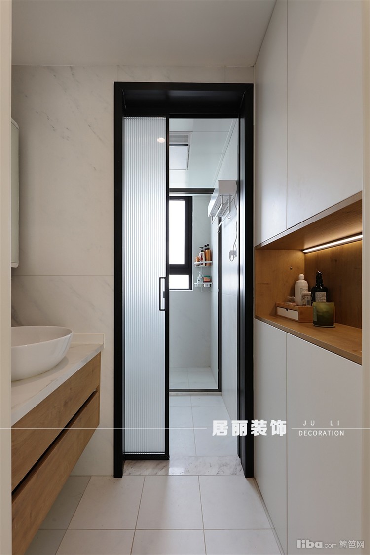 浴室做了干湿分离区域划分,墙地一体的1200*600白色瓷砖打造一个清爽的空间,在这里洗浴,去掉一天的风尘仆仆。