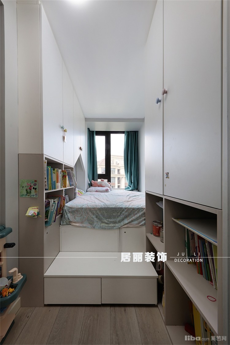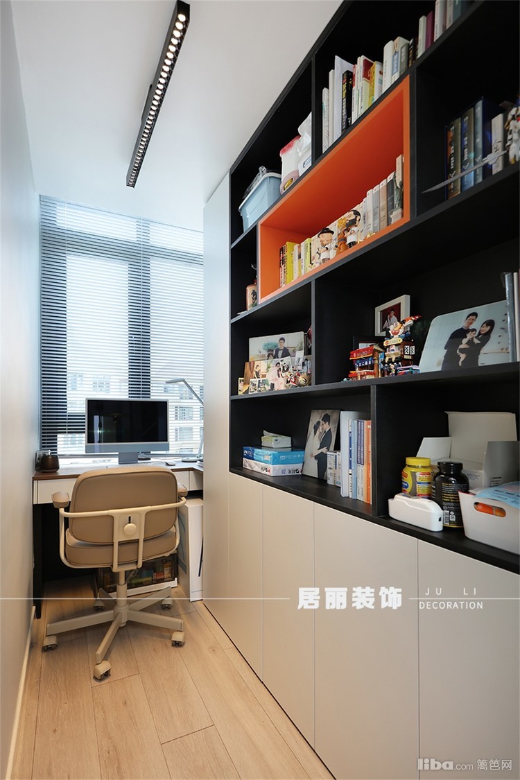 设计师将原先设备平台扩入书房,扩大书房面积,利用书柜将原先阳台包管包进书柜,增加收纳的同时,也更美观