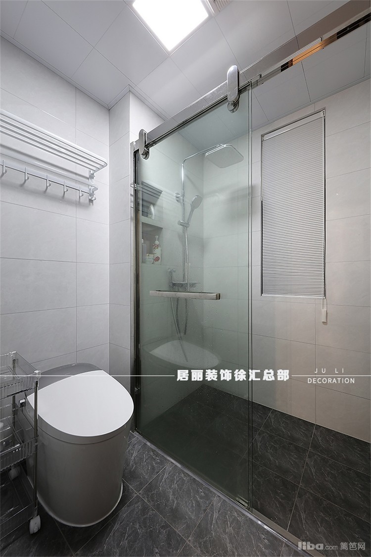 05_卫生间 以线性灯点缀空间,串连空间和空间之间的关系。卫生间洗手台外置,干湿分离设计,卫生间门选择磨砂玻璃,透光且保障私密性。