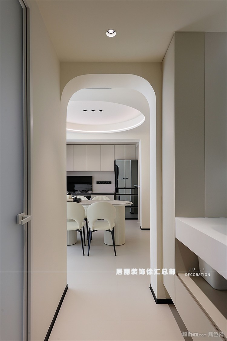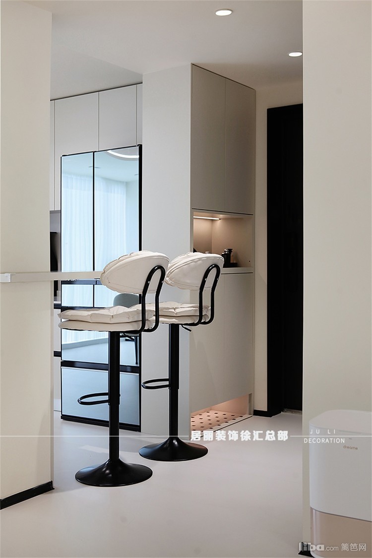 推门入户,左侧立见储物玄关柜与吧台相连,玄关柜中间镂空放物,底部留空方便换鞋,有效兼顾厨房隐私与实用性。