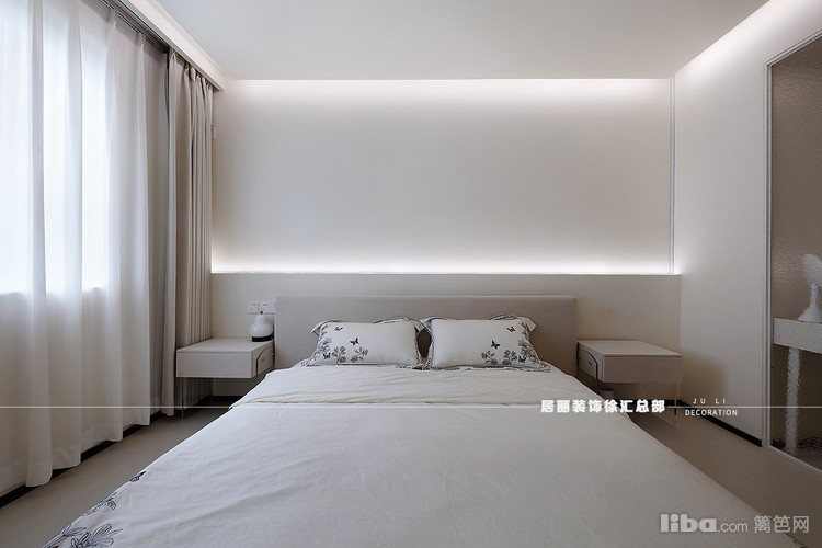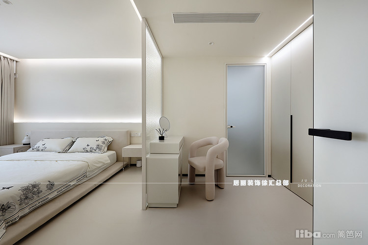 主卧延续客厅的弧形悬浮吊顶,奠定柔和基调。