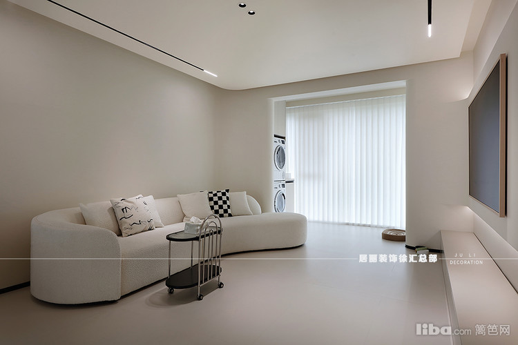 墙顶之间巧用弧形柔化梁体的锐利感,契合悬浮电视背景墙的弧度,视觉上自然流畅。
