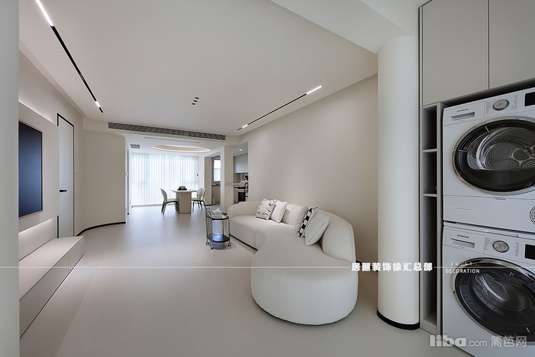 阳台一侧打造储物柜,主要用于收纳家政用具,嵌入洗烘套组,隐藏在角落保持公区视线清爽,实现颜值功能双丰收。