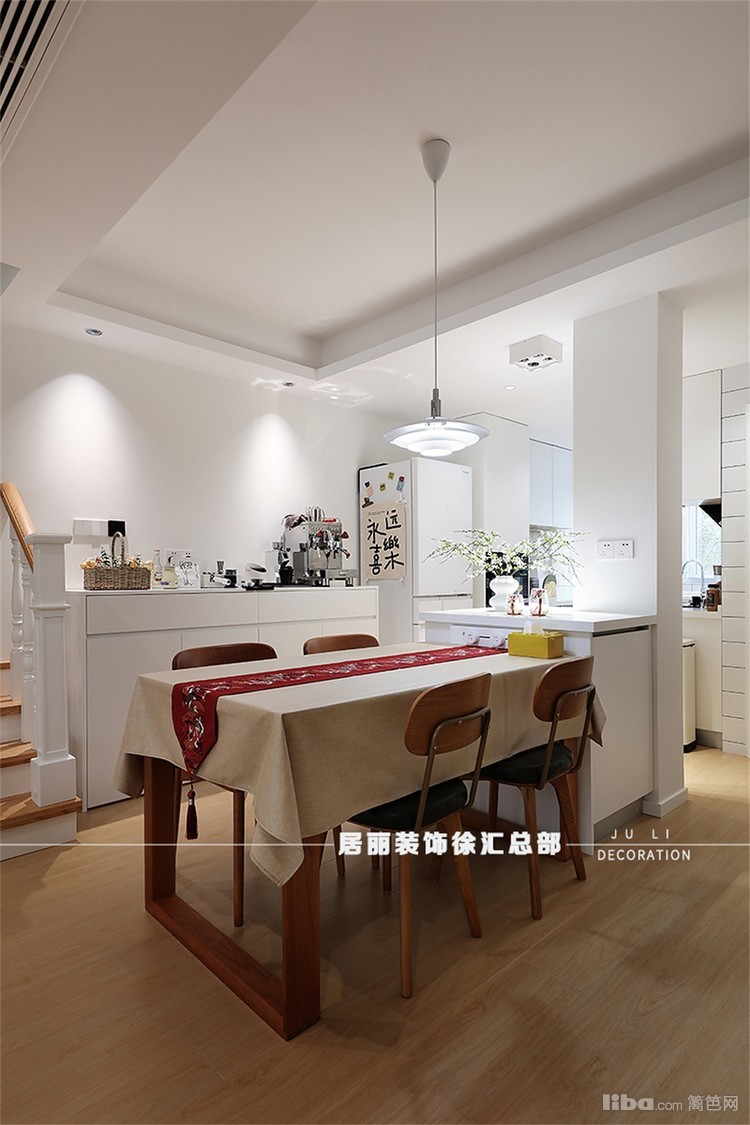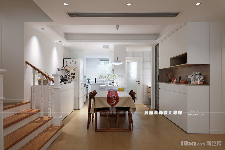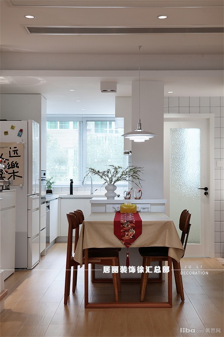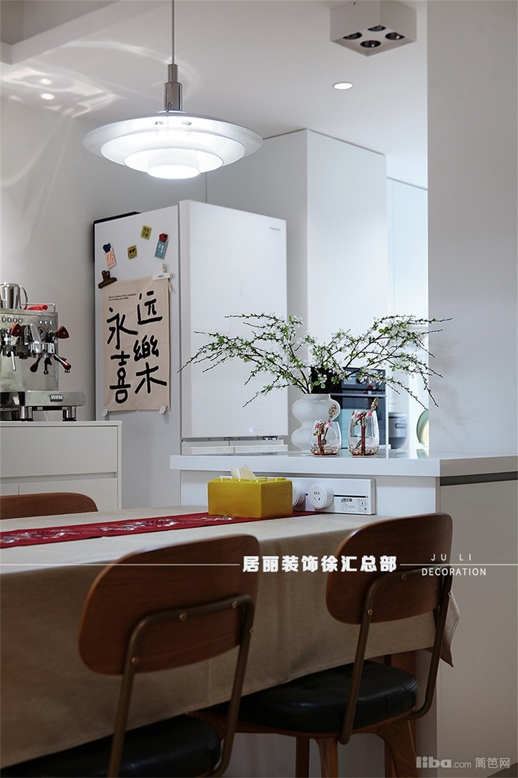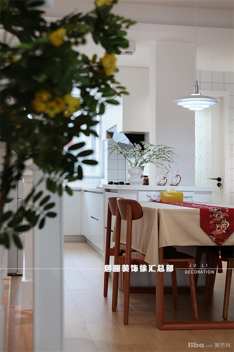 客户是年轻人不经常做饭的,设计师把厨房墙体全部敲掉,和餐厅打通,一进门整体视觉上就宽敞很多。