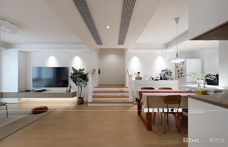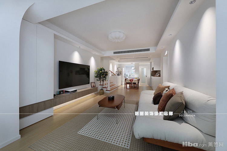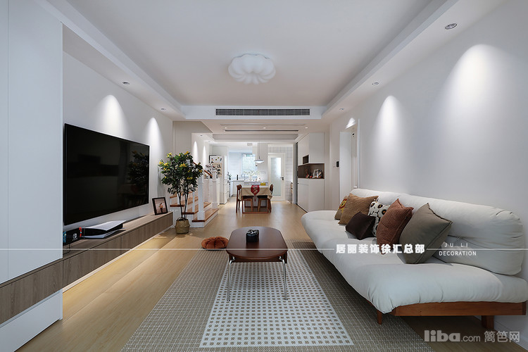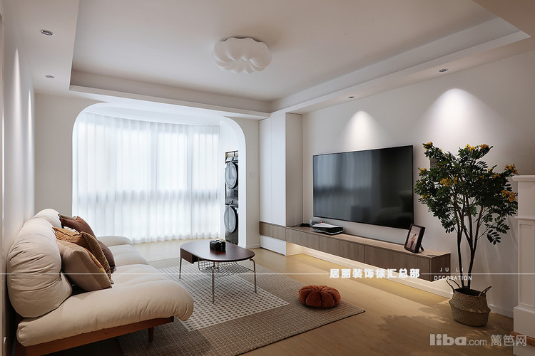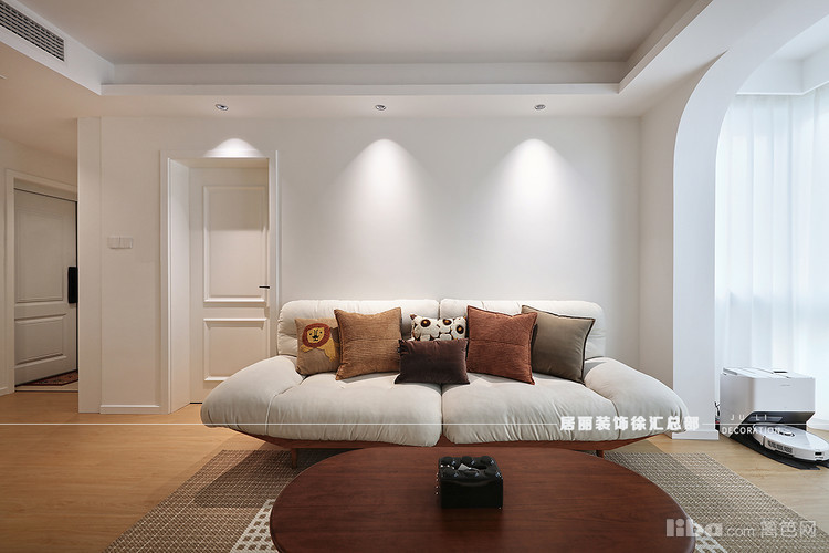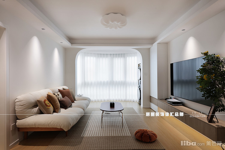 客厅以米色为墙面色彩,融合白色、木色,营造简洁淡雅的空间氛围。