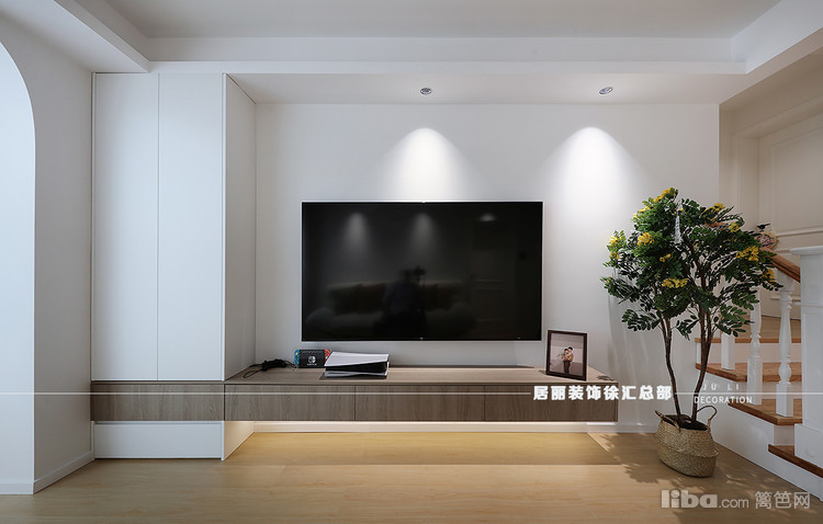 高柜和悬浮电视柜相结合作为背景墙,不仅增加了储物空间,整体上也更显活泼,使整个客厅都活跃起来。