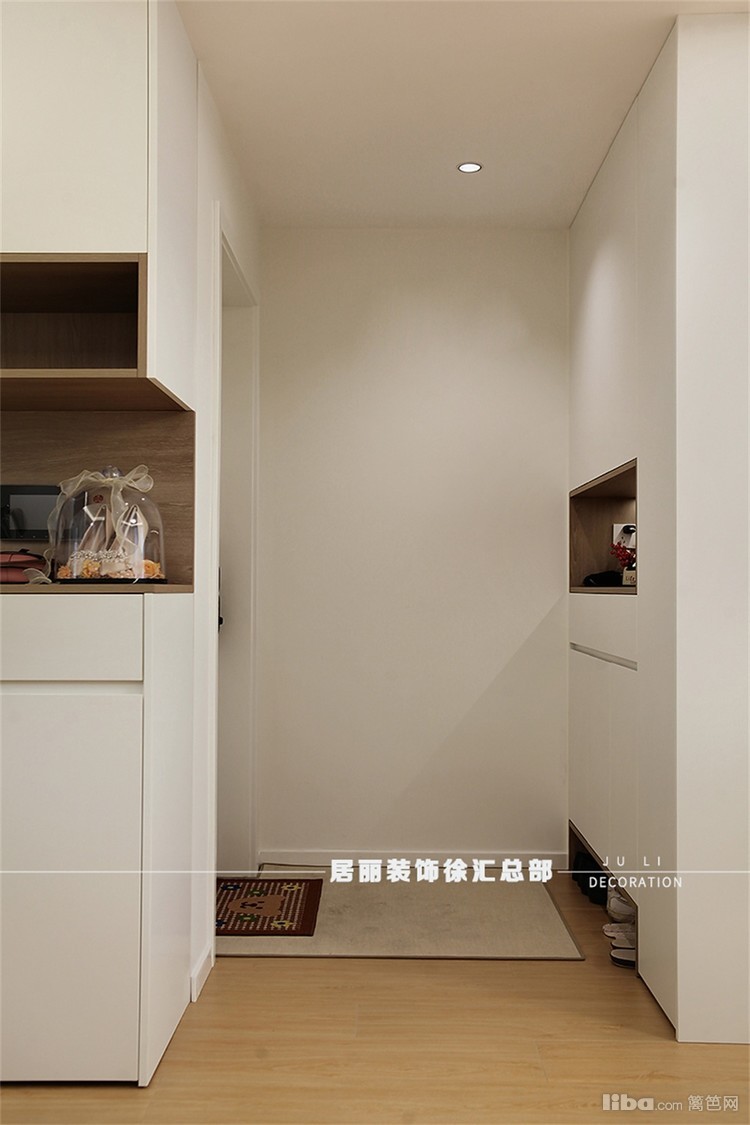 一进门设置了鞋柜,中间镂空可以放置钥匙等随手物品,最下面镂空方便进家后不打开柜门就可以把鞋子塞进去,并且设置了感应灯,手一挥灯光就自动亮了。