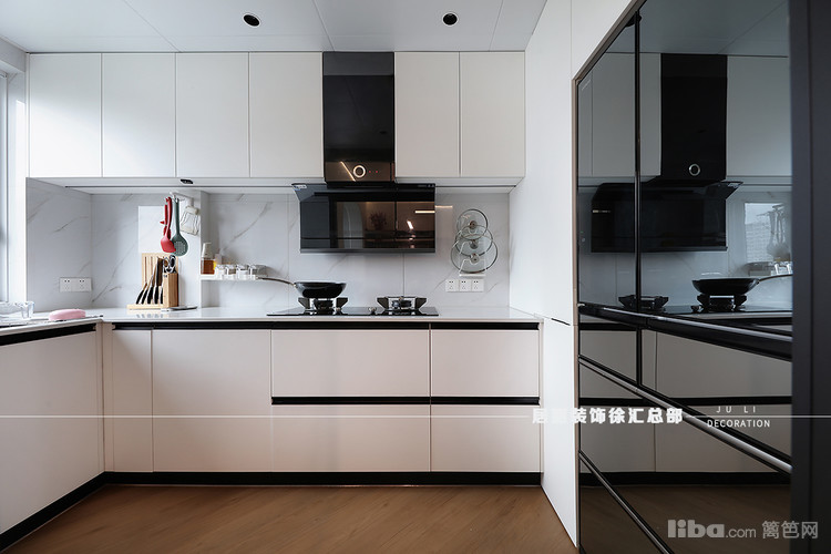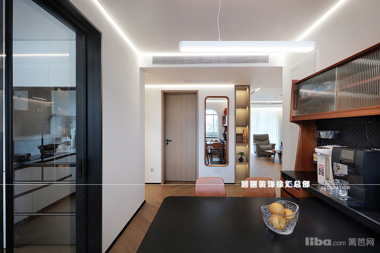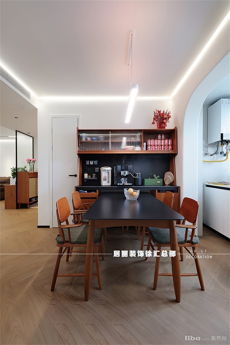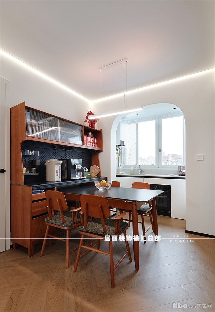 餐厅搭配了网红成品餐边柜,既时尚又温馨。中西厨的分区规避了中式的烟火气息,给空间增添了几分小资情调,满足了与小朋友一起制作点心的空间。