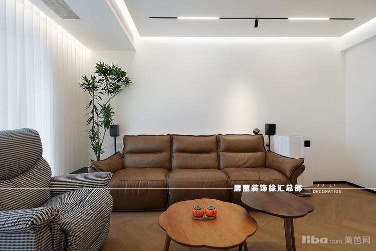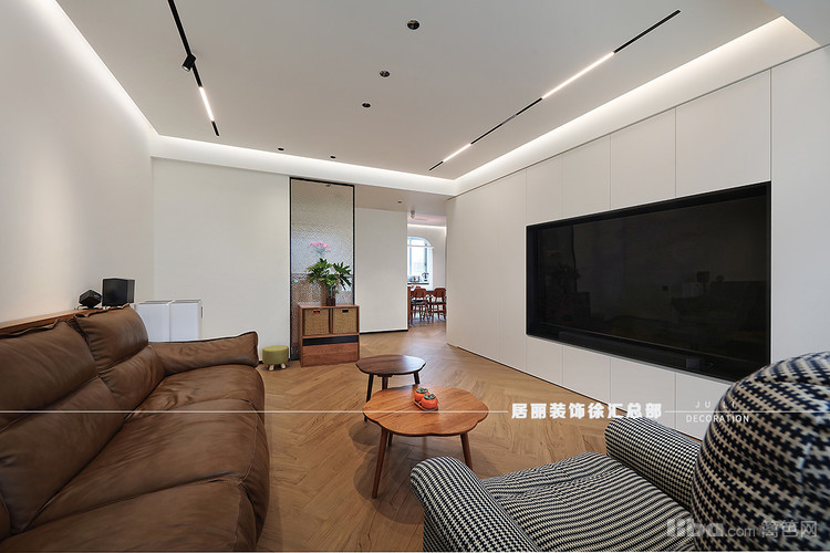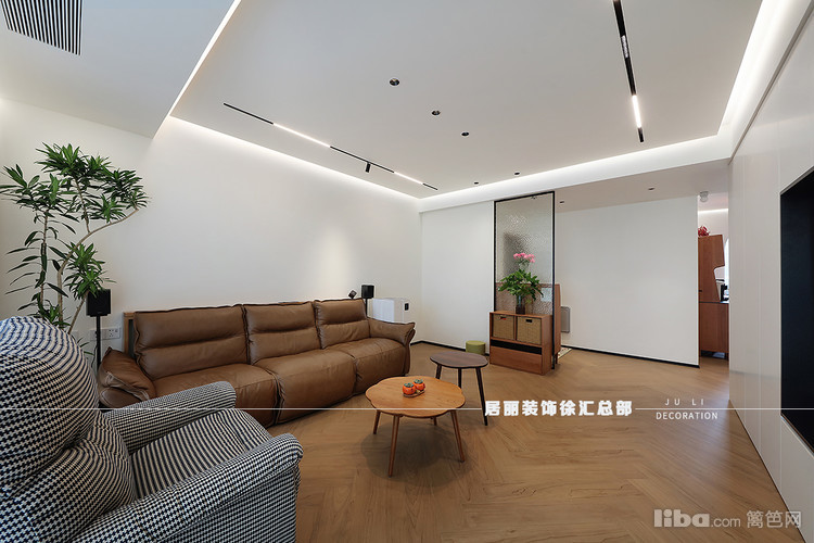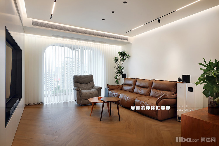 客厅的人字铺地板砖、悬浮顶、梦幻帘、拱门、悬浮顶,整个区域的光线被均匀的容纳,平等的触及家具的各个角落。