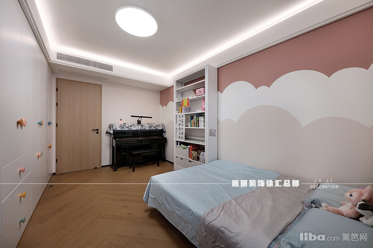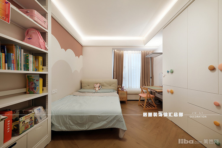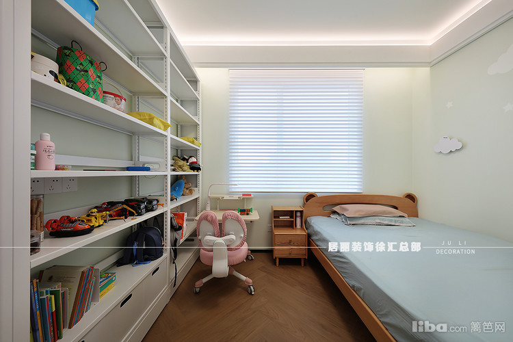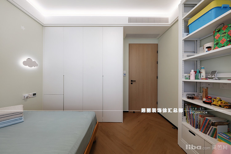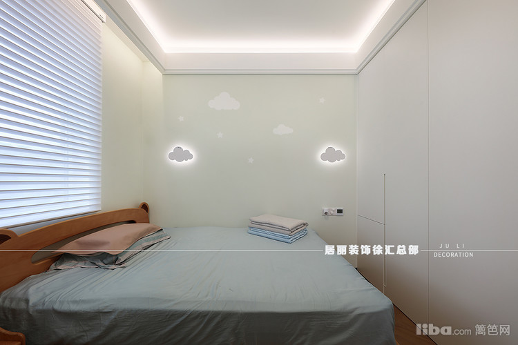 三色的云朵墙,五彩不同规格的纽扣把手,肯定是可爱俏皮的小女孩。人是生活空间中的主角,小男孩的空间也有自己的热爱,蓝天白云重启了无限的维度想象力,意识引向深远的远方。