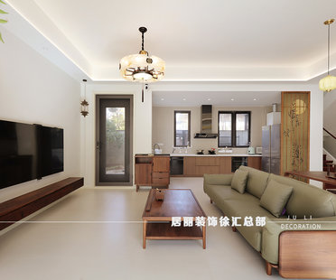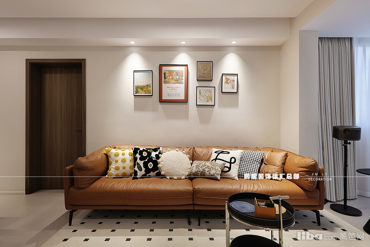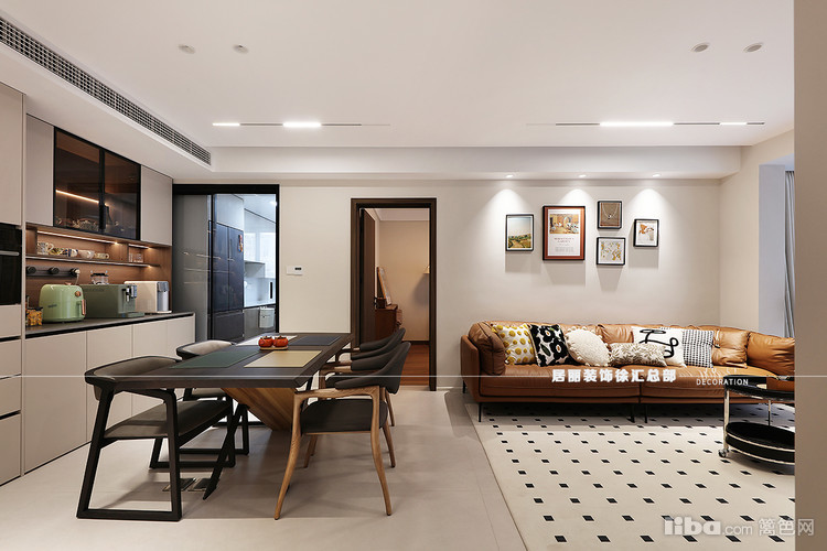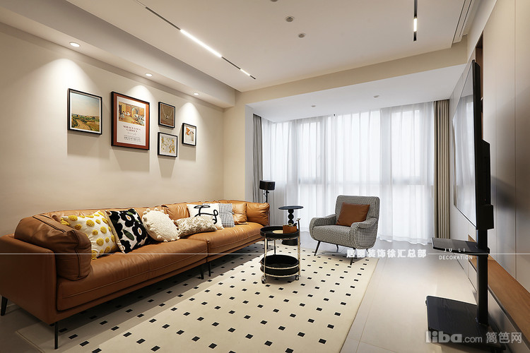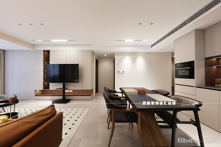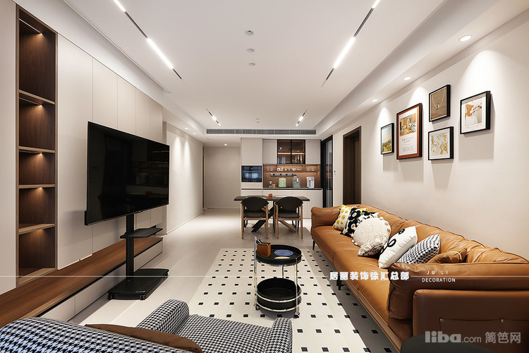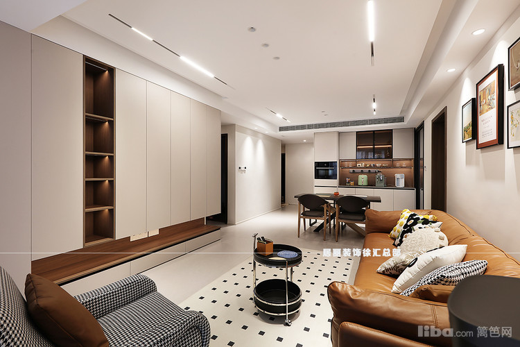 客厅采用无主灯设计,满墙的收纳柜子增加储物空间。