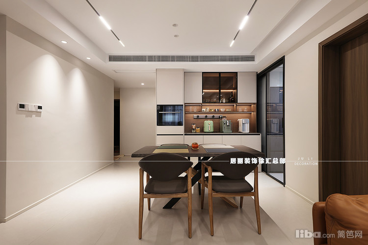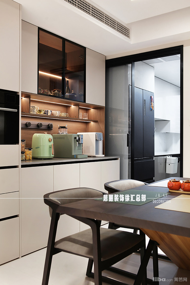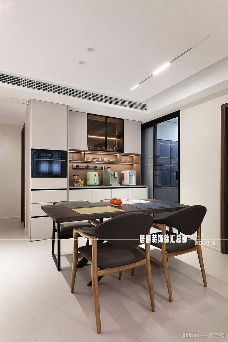 整体柜子的颜色统一,搭配顶面主光源 柜子辅助光源 让整个用餐环境更加舒适。