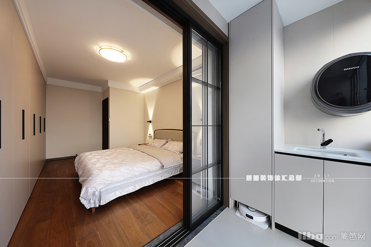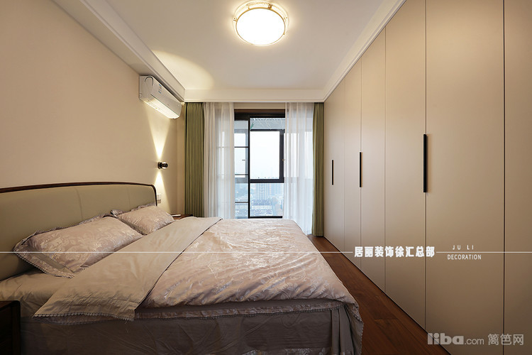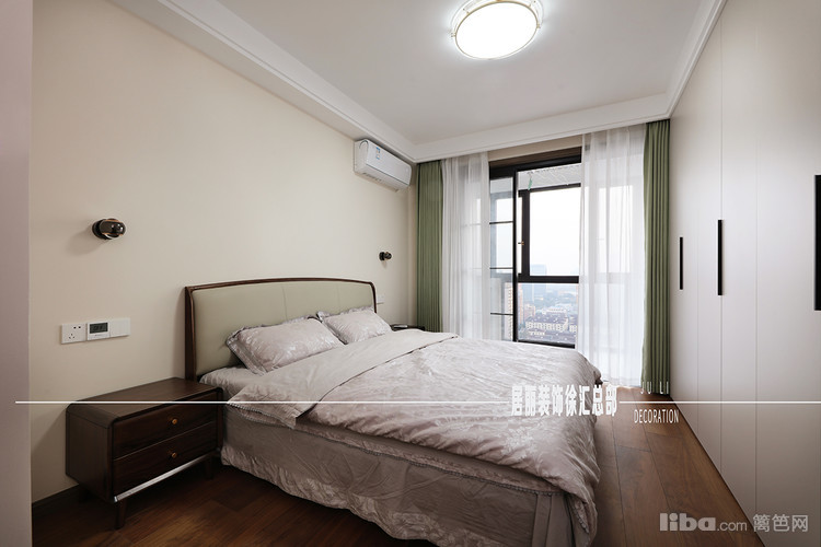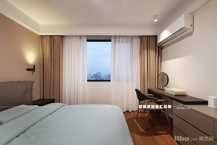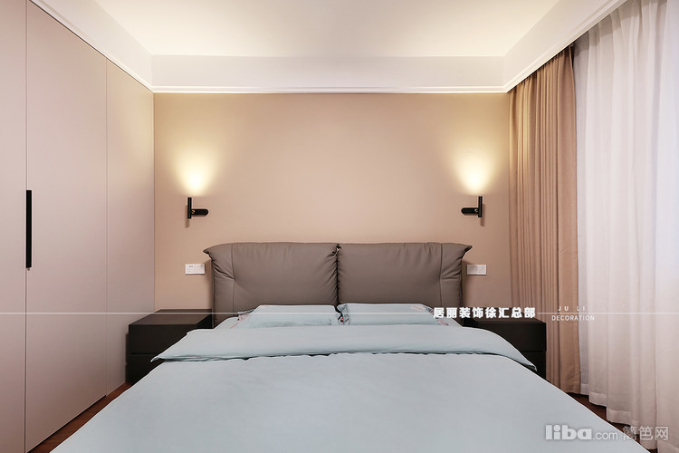 使用功能齐全,床对面一排整齐到顶的衣柜,简约的造型,尽可能保证收纳同时 留大空间 。
