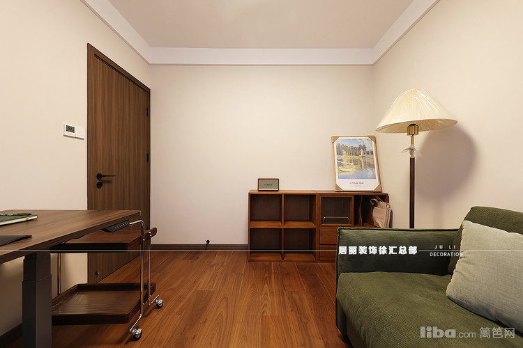 书桌在窗前光线充足,胡桃木色家具饱和度低,沉稳,静谧。
