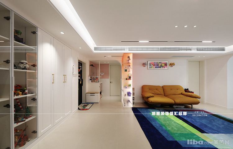 空间整体洁白用色,通铺同色系的地砖,丰富的软装颜色增加层次
