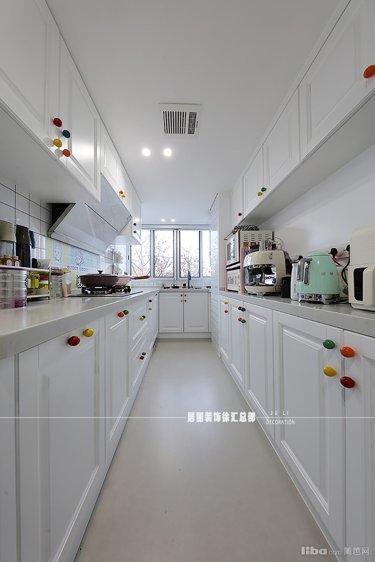 原户型厨房是一个非常大的空间,设计改造后,原厨房一分为二,U型厨房,让洗 切 炒,起锅的操作在转身之间高效完成,实现方便,实用方便快捷的烹饪体验,符合现代人快节奏的日常需求。