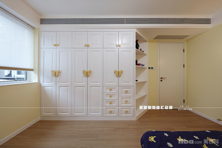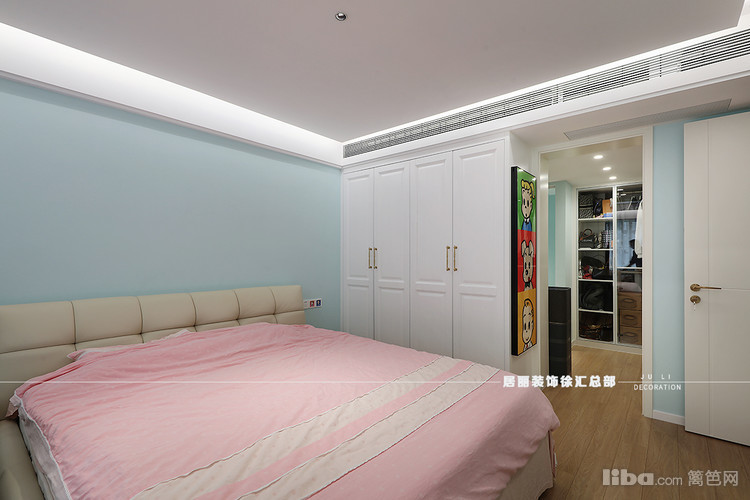 床边是六扇门大衣柜,原本设计师怎么算距离都不够,还要加上主人心心念念的衣帽间,索性砸了主卫隔墙
