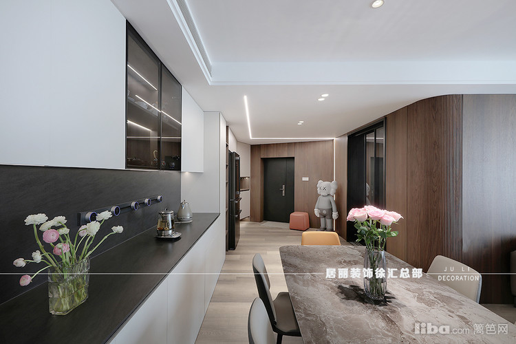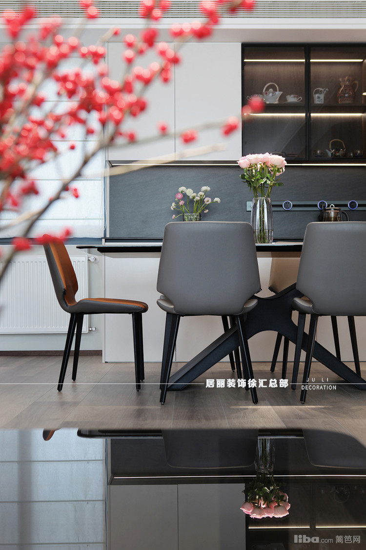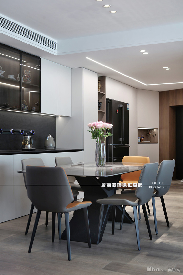 整个餐厅的设计尺寸细节与西厨的颜色相互协调,西厨的平板门及深色岩板台面 方便打理 增加质感