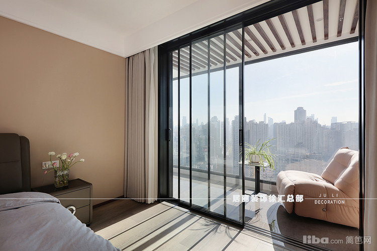 浅咖色衣柜顶天立地于角落中 整体配色浅饱和 让卧室趋于舒适 安稳。