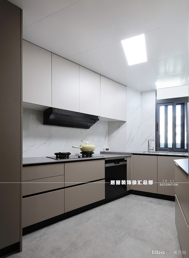 厨房由于空间异形 采取了弧形+异形台面 使动线合理 最大化的增加储物空间 U型橱柜符合洗切炒的动线