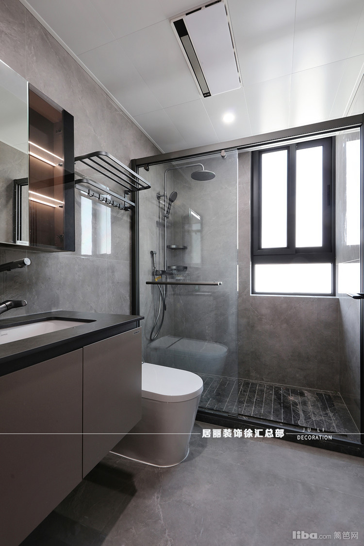 卫生间的空间借助了一部分衣帽间的空间 内嵌的洗烘叠加 门口依次台盆 马桶 淋浴房