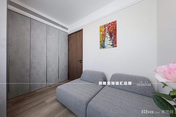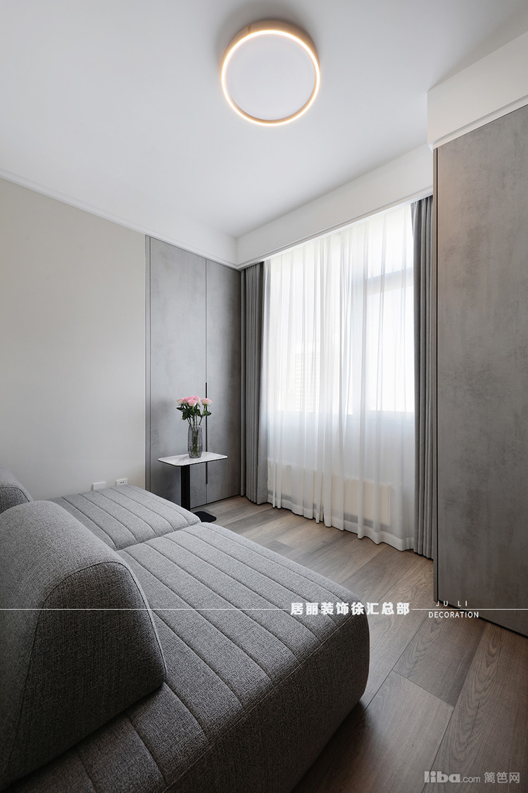 衣帽间:灰色L型的衣柜+内嵌衣柜的组合 一门到顶 换季的衣服和被子都有地方归类收纳