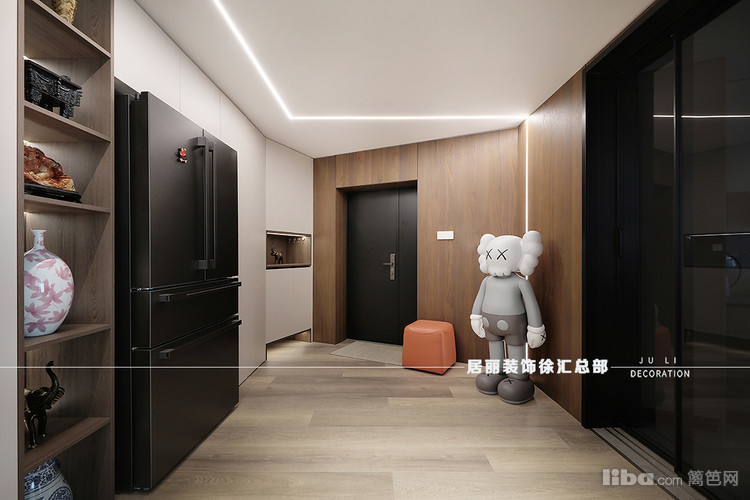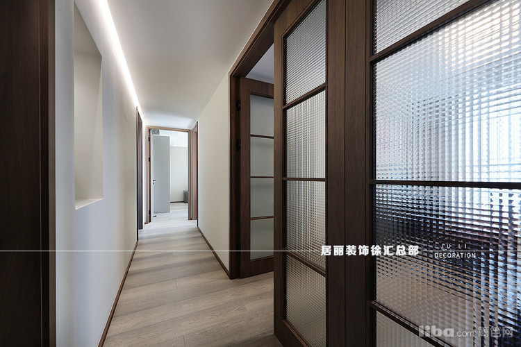 胡桃木木饰面背景连接到门厅 转角采用弧形拉槽处理 不做过多的装饰 简约高级