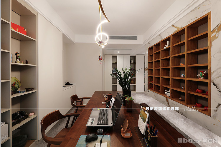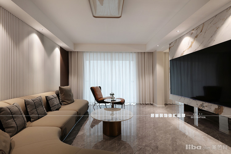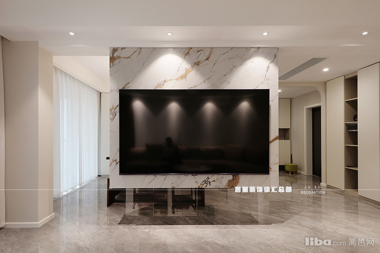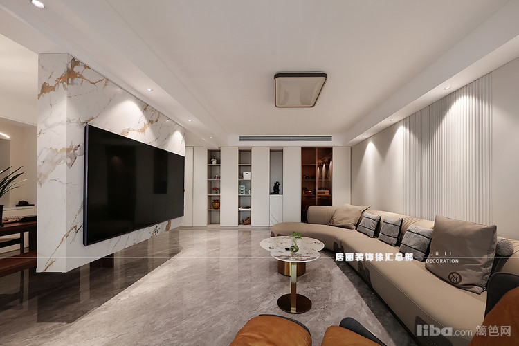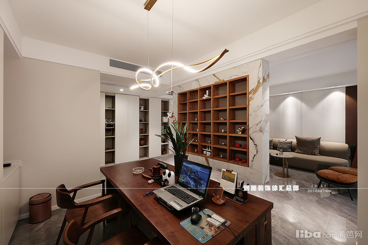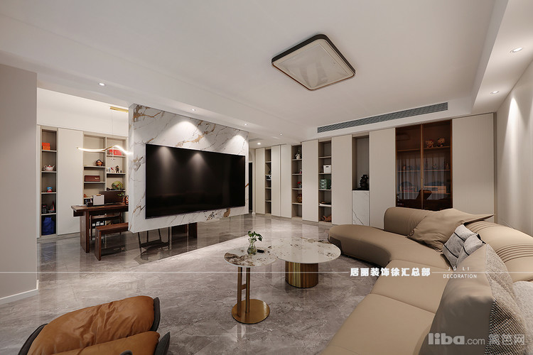 客厅以悬浮电视墙做空间区分 保持通透感的同时 增加书房茶室多功能区域