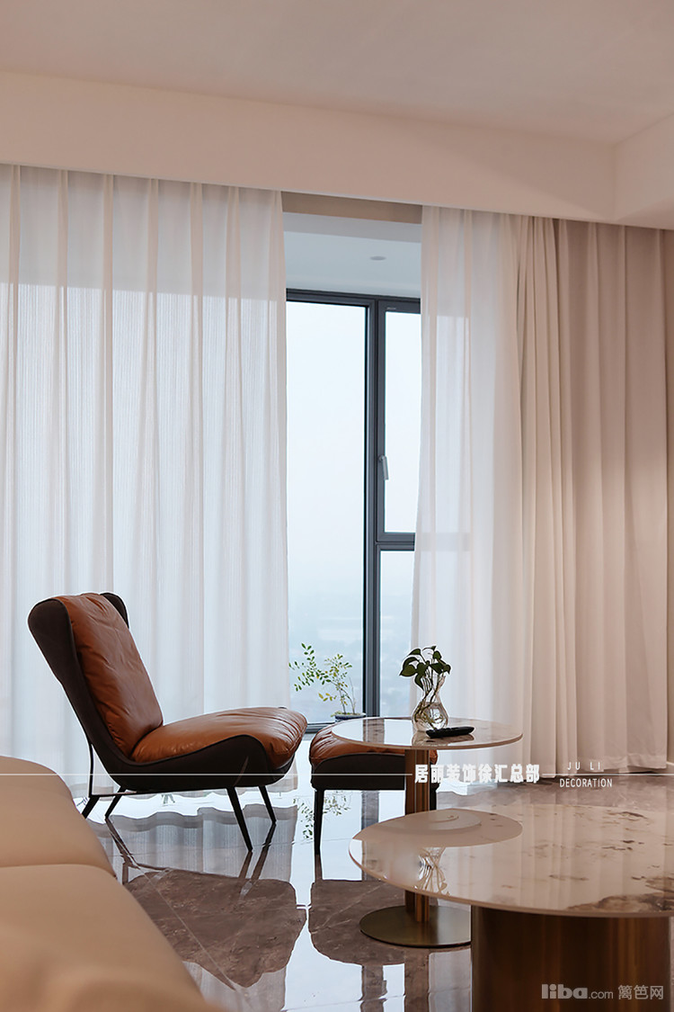 巨大的落地窗使得空间更加明亮,为客厅刻入广阔景致,纱帘将景致朦胧化,转译出别样的风景