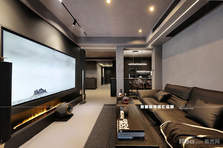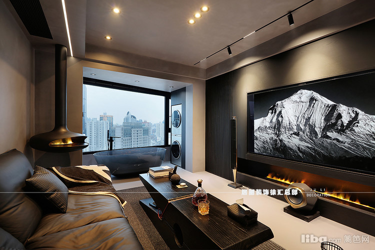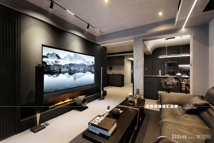 客厅电视墙经典黑色木质肌理与壁炉的光影交错,不囿于框架束缚,亲近着人间的喜乐。