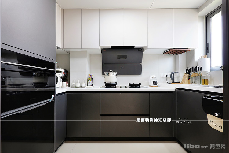 首先吸引眼球的就是他的配色,下柜深灰色上柜白色,和客餐厅相呼应,一个电器高柜把洗碗机和烤箱都完全塞进这个空间内,节省空间的同时又加入了美观和实用