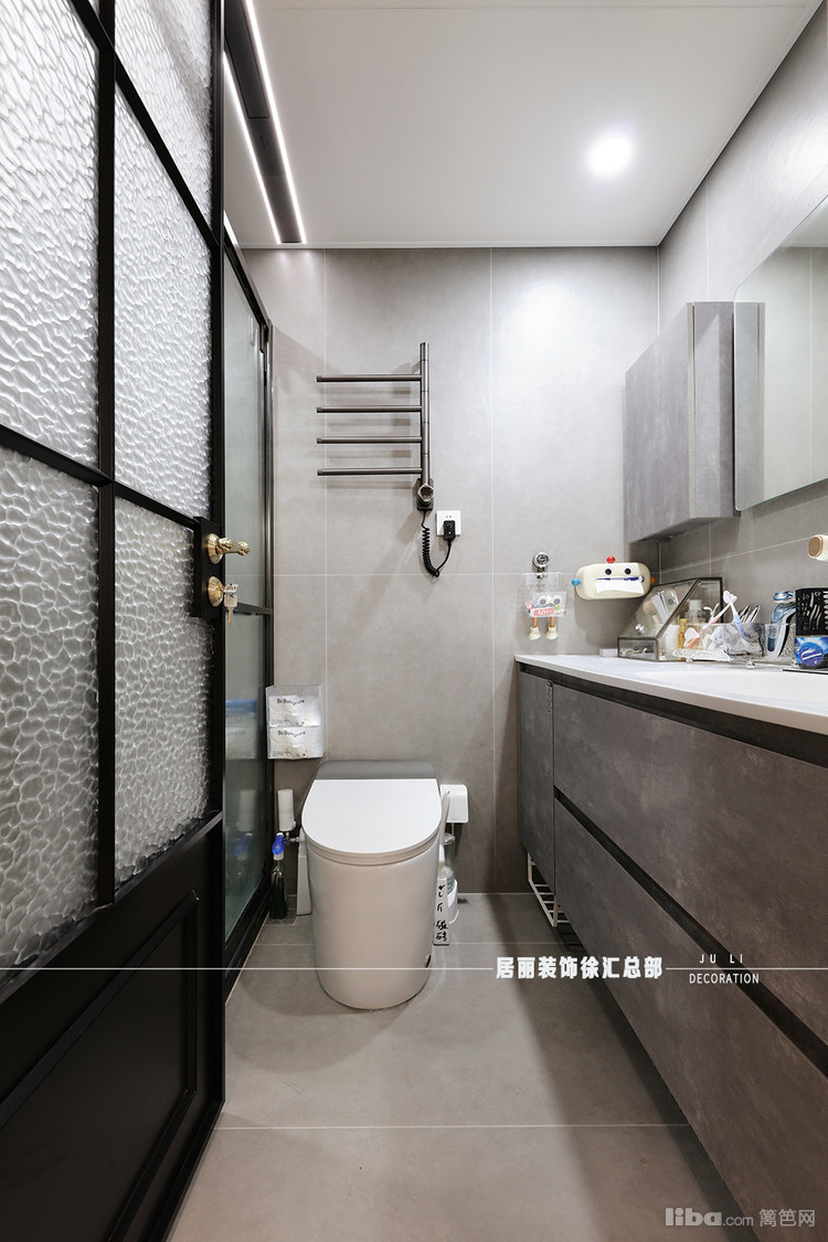 顶面采用的蜂窝大板,增加了一些有氛围的灯带和筒灯,让空间更有趣。定制的台盆储物空间拉满,节俭的电动毛巾架,更加实用。卫生间配色也延续了客餐厅和厨房的配色,沉稳简洁。