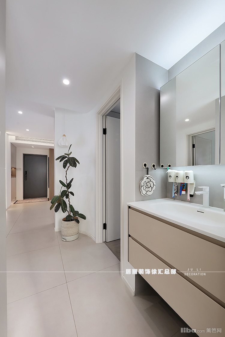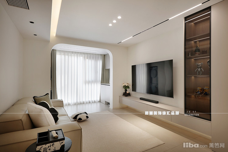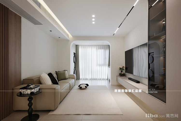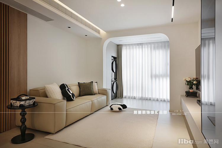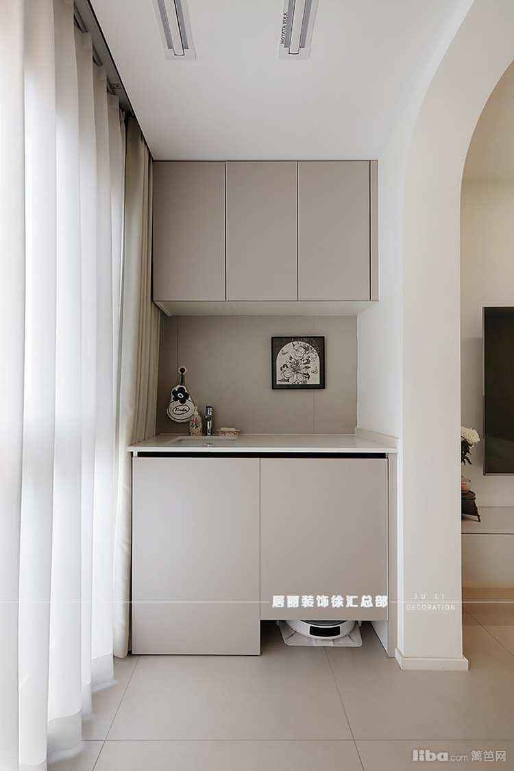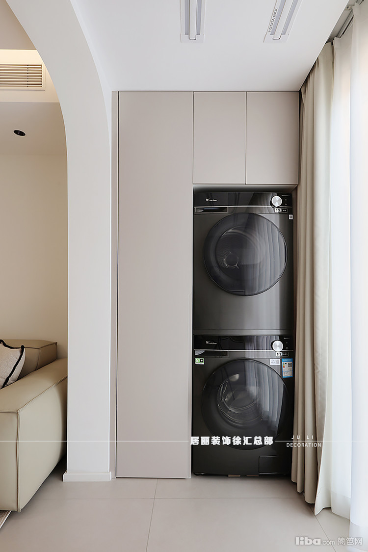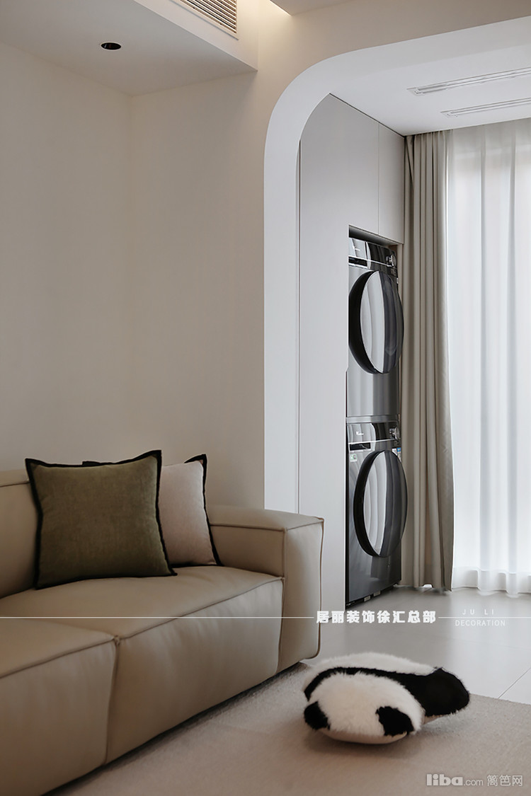 以弧形墙面平滑过渡;客厅与阳台相通,安装双轨道晾衣架,一侧安装洗手盆和收纳柜,内嵌洗衣机和烘干机,空间功能划分明确,实用性满分。