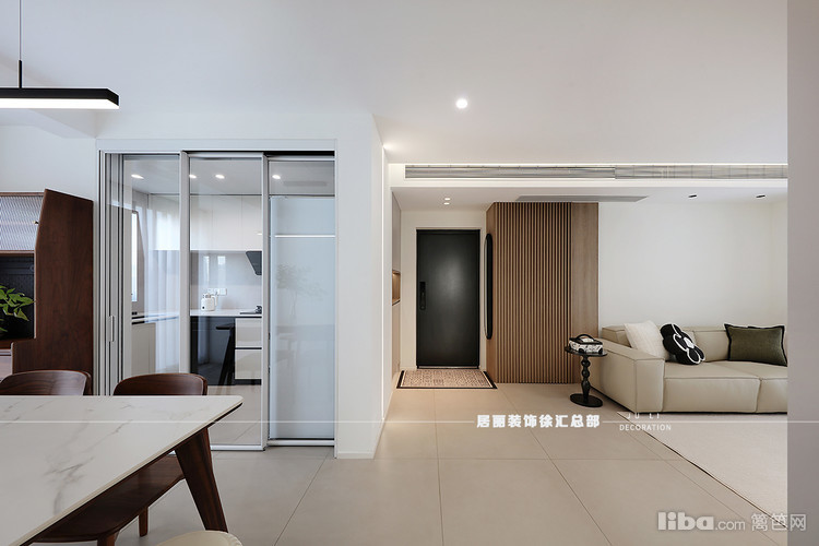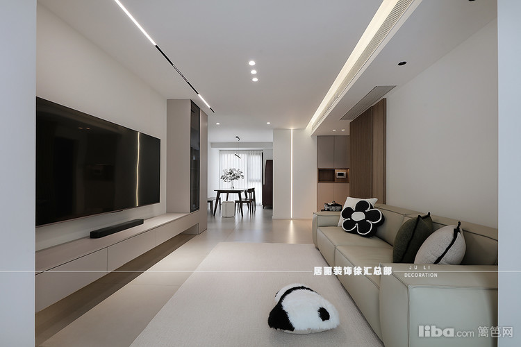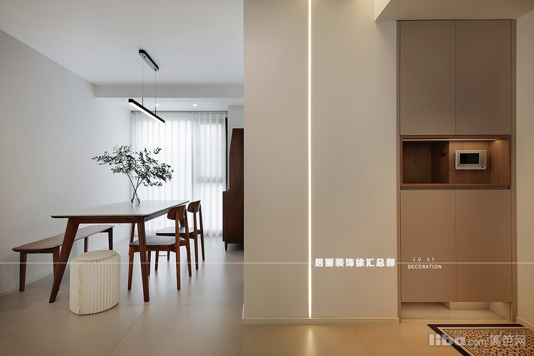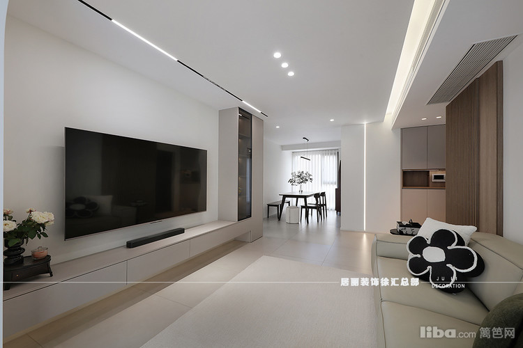 悬空的一组电视柜,提供收纳杂物的空间,右侧的一组玻璃装饰柜,将客餐厅收纳子然分割,也装饰了墙面。