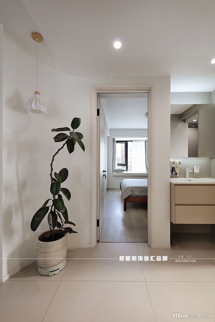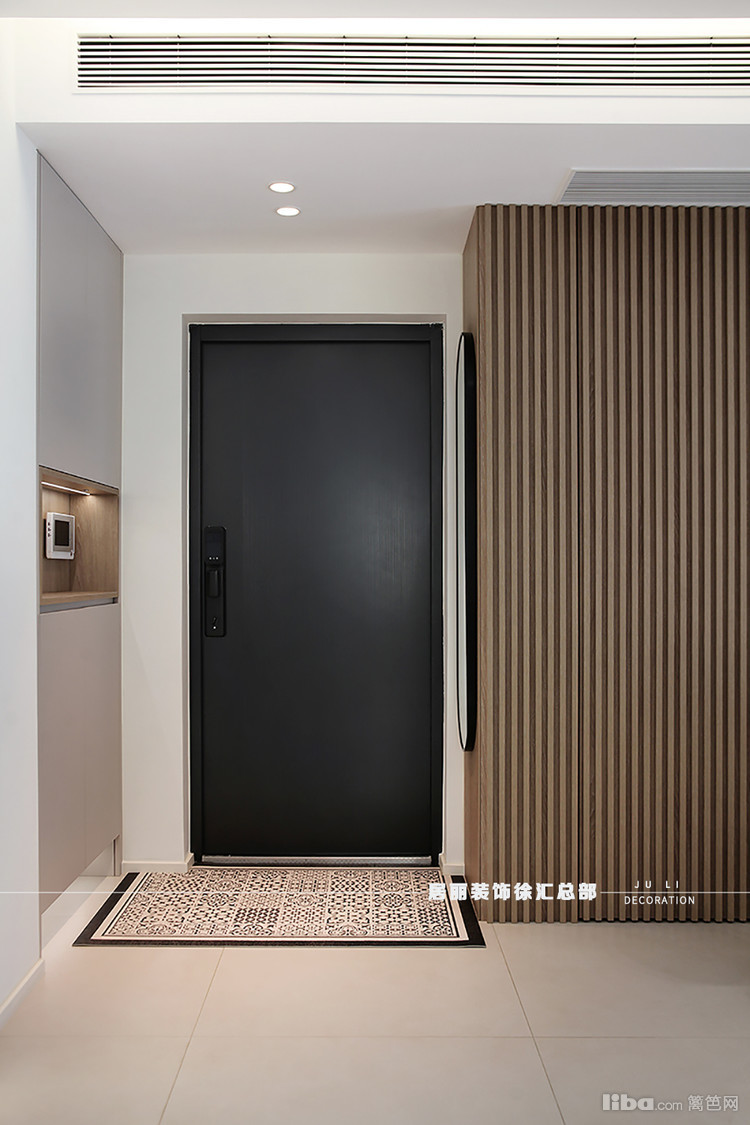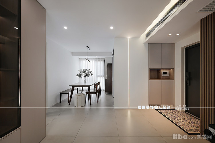 玄关柜中部留空,布置业主喜欢的小摆件,精致又美观。柜底部留空设计,方便业主收纳鞋子。