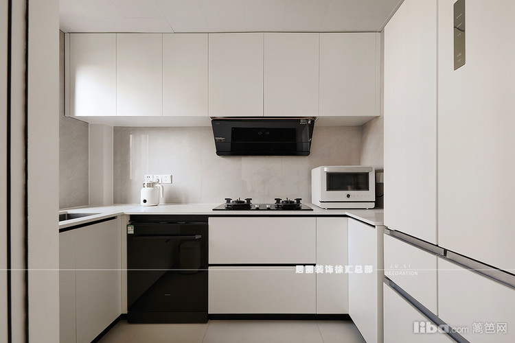 整个厨房做了U型布局的设计,整体奶白色橱柜,搭配素色瓷砖 ,空间看上去更开阔,光线也更好了。