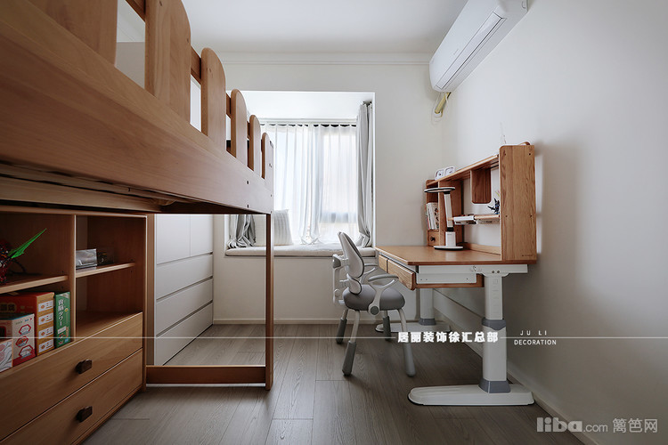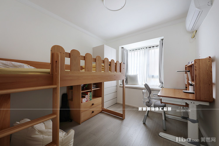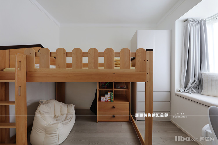 木色与白色的组合搭配能够营造出简洁温馨的气氛,上层是睡觉休息的区域,下层则是学习,娱乐与储存物品的区域。