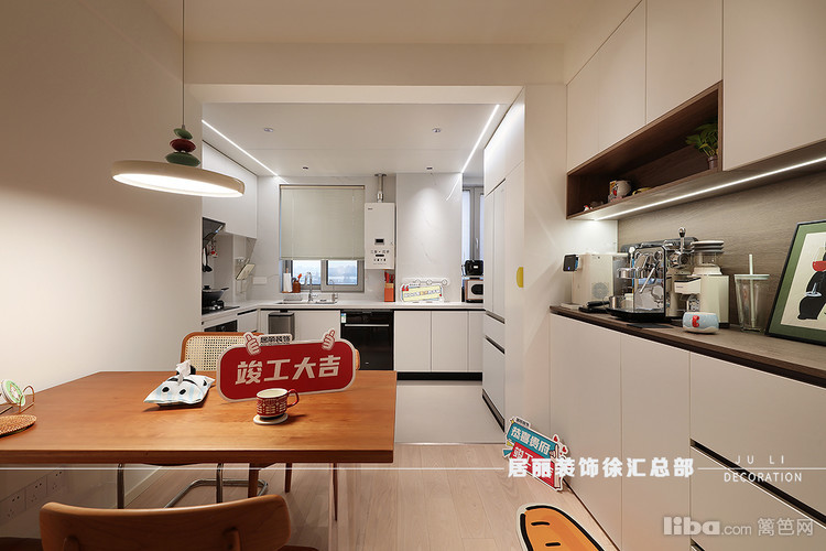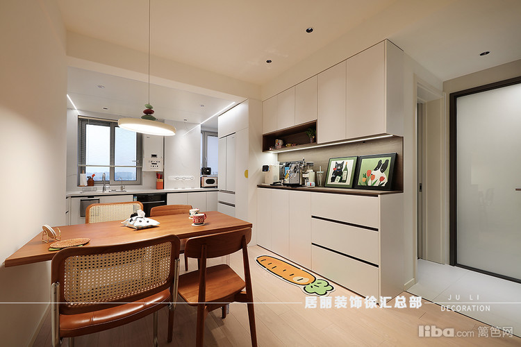 厨房位于整个房间的北面。原始户型,厨房和餐厅面积较小。设计师在设计方案时,将厨房和北阳台这块区域整合在一起。