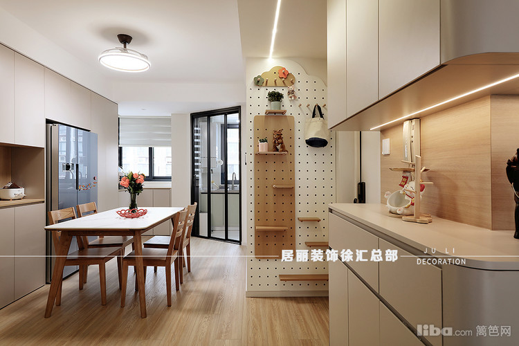 厨房相对较小,业主的双门冰箱嵌入在餐边柜里,和餐边柜齐平,既增加了储物空间的需求,又达到了美观的效果